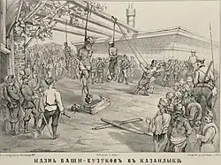 A special Turkish military committee was established to quell the uprising. Regular troops (Nizam) and irregulars (Redif or Bashi-bazouk) were directed to fight the Bulgarians (11 May – 9 June 1876). The irregulars were mostly drawn from the Muslim inhabitants of the Bulgarian region. Many were Circassians from the Caucasus or Crimean Tatars who were expelled during the Crimean War; some were Islamized Bulgarians. The Ottoman army suppressed the revolt, massacring up to 30,000[30][31] people in the process.[32][33] Five thousand out of the seven thousand villagers of Batak were put to death.[34] Both Batak and Perushtitsa, where the majority of the population was also massacred, participated in the rebellion.[31] Many of the perpetrators of those massacres were later decorated by the Ottoman high command.[31]