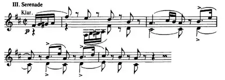 - The third movement, Serenade, opens with a theme played by two oboes, later developed by the strings.[5] It includes an imitation of bagpipes, played on oboe, clarinet, bassoon and cellos.: