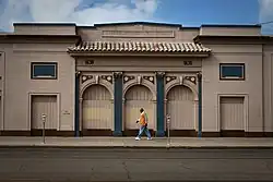 The Rustigian Building is a one-and-a-half story Classical Revival building with scored stucco siding, a flat roof with a parapet and simple cornice. An arcade is located at the center of the front façade with “J.M. Rustigian” inscribed above.[5] It was designed by the architecture firm of Schwartz & Rayland. Schwartz & Rayland were known for designing residential, commercial and school buildings throughout the Central Valley. They later expanded to the Bay Area and by the 1930s had established branch offices in Monterey and Salinas.
