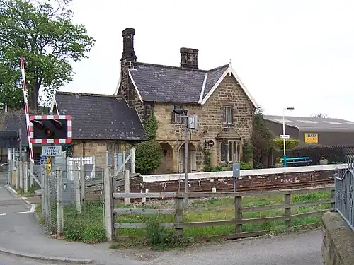 The main railway building, which remains to this day and is now grade II listed, was designed by the architect G T Andrews and was built in 1850 at the request of the York and North Midland Railway who owned the line through acquisition.[5][6] Immediately to the west of the station is an automatic barrier level crossing and a lattice-work iron bridge over the River Esk.[7] The original Whitby and Pickering Railway bridge was made from Baltic pine and covered a distance of 312 feet (95 m), crossing the river on a diagonal compared to its flow.[8][9] The design of the station was similar to that at Sleights railway station, but with Tudor arches and Tudor chimneys.[10]
