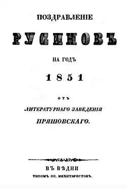 That same year, Dukhnovych founded a literary society called the Literaturnoe zavedenie priashevskoe, which operated until 1853.[35][40] The society aimed to unite the literary-minded Rusyn intelligentsia, establish a literary journal, create a Cyrillic printing press, and found a museum of Rusyn culture.[38] Despite its ambitious goals, the society was dissolved by imperial decree. During its three years of existence, it managed to publish 12 Rusyn books, including two additional almanacs (Pozdravlenie Rusynov na god 1851 and 1852), a textbook (Short Geography for Rusyns), a catechism, and the prayer book Bread of the Soul also Religious Prayers and Songs of Eastern Churches and Orthodox Christians, published in 1851. This prayer book became the most popular devotional text among Rusyn believers.[38][40] The Mukachevo Eparchy, however, did not support Dukhnovych's society and never purchased a single book published by it.[35] The eparchy's pro-Hungarian orientation and its desire to maintain good relations with Hungarian intellectuals led to its lack of support for the Rusyn awakening.[35]