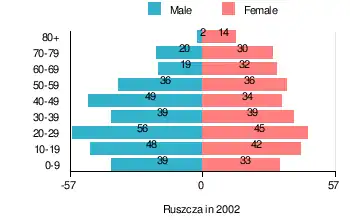 According to the 2002 Poland census, there were 613 people residing in Ruszcza village, of whom 50.2% were male and 49.8% were female. In the village, the population was spread out, with 23.2% under the age of 18, 38.7% from 18 to 44, 21.4% from 45 to 64, and 16.8% who were 65 years of age or older.[1]