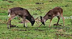 The fallow deer (Dama dama) is an ungulate which employs an unusual strategy for mating during the rut. This strategy is the creation of a lek, a display area presented to the females where the males gather and allow the females to choose a mate based upon their traits alone while reducing predation risk, disturbance to copulation, parasite transmission and the cost of looking for a mate.[24][4] When females come to the lek they leave soon after mating but the males will tend to stay in the lek to court other females until the end of the rutting season.[25] However, male fallow deer which are unsuccessful in mating will leave the lek sooner than other males and they will adopt other strategies to compensate for their lack of mating success in the lek. Furthermore, the duration spent in the lek is positively correlated with the behavioral traits of male display frequency and aggression, male hierarchical position and secondary sex characteristics such as antler size.[26] Overall, lekking species such as the fallow deer have a short intense rutting season where the males face intrasexual competition, territory defense and management of females within their territory.[27]