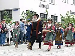 On "Ruten Monday" morning, a big parade called Historischer Rutenfestzug with roughly 6,000 participants winds its way through the old town of Ravensburg. 4,500 pupils and adults parade in historical costumes presenting the town's history from medieval times, when Ravensburg was an international trading centre, to the 19th century. The three-hour-long parade also includes 120 horse-drawn carriages, all Rutenfest drumming groups, and many wind and brass bands from Upper Swabia with c. 1,200 musicians in total. In 2012, c. 50,000 spectators lined the streets along the parade.[6]