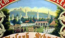 - Trommlerball ("drummers' ball") on the following Thursday night is a dance ball and society event organized by the Trommlerkorps der Gymnasien, roughly comparable to a débutante ball. All Trommlerkorps members take part in social dances with their Trommlerbraut ("drummer's bride"). Initially held at the Konzerthaus until ca. the 1960s, the ball was held in the congress centre in the neighbouring town of Weingarten until 2017 and again from 2022.[9] In 2018 and 2019, the ball took place in the Oberschwabenhalle multi-purpose hall in Ravensburg. The Trommlerball attracts between 500 and 1,000 guests.[10]
