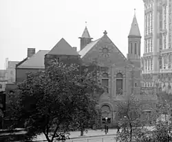 According to the Rutgers Church's official Website, "By 1830… Rutgers had become the largest Presbyterian church in the denomination, with 1,157 members. The old frame church was replaced in 1843 with a large stone structure (still standing and in use as the Roman Catholic Church of St. Teresa)."[2][3] Church records indicate that this building is a hitherto unrecognized work by the important New York architect Minard Lafever, designed at a time when Lafever was transitioning from an architect who specialized in the Greek Revival to one who employed the Gothic Revival for his churches. The congregation subsequently moved into the Lenox Chapel (29th and Madison) in 1863. They razed it in 1873 and built a new church at that location. Fifteen years later, the congregation sold this property and used the proceeds to build a chapel (1888) and church (1890) at the corner of 73rd Street and Broadway—near the Ansonia Hotel.[2]