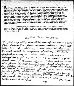 During the Armenian genocide, Parmelee was stationed in Kharpert where she continued to conduct her missionary activities. She is believed to have been the only physician in the town.[5] Therefore, she was often preoccupied with caring of those suffering from the events. In the beginning stages of the Armenian genocide, Parmelee recounts the initial arrests of the Armenian intellectuals of the town: