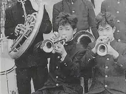 Some of the country's first major stars were singer Ichiro Fujiyama and composer Masao Koga. Koga attempted to initiate fusion of Western jazz and Japanese dodoitsu.[16] Fujiyama's 1931 song "Sake wa Namida ka Tameiki ka" (酒は涙か溜息か, lit. "Is Sake Tears or Sighs?"), composed by Koga, became a major hit in Japan. This song created a fusion of Fujiyama's crooning and Koga's guitar play.[16] Using the vocal technic Mezza Voce with a microphone, Fujiyama sang the song by the deep voice of not Opera's G minor but D minor.[16] Fujiyama's song "Oka o Koete" (丘を越えて, lit. "Beyond the Hill") sold 600,000 copies.[17] However, Fujiyama was an elite student, who specialized Western classical music in the Tokyo Music School. Ryūkōka songs often dealt with the "Ero Guro Nansensu" things.[18] Since his school regarded ryūkōka as bad form at that time, Fujiyama was once suspended from the school, though Fujiyama was not dismissed from the school because Klaus Pringsheim Sr., a professor of the school, opposed the proposal of Fujiyama's expulsion.[16]