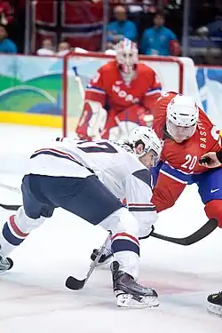 Having developed into a top defensive forward in recent seasons, Kesler was an early candidate to be selected to the American team for the 2010 Winter Olympics in Vancouver, at the time the city in which he played his NHL hockey.[130][131][132] The United States played hosts Canada in the final game of the preliminary round to determine top spot in the pool. With United States up by a goal in the final minute, Kesler dove past opposing forward Corey Perry to score an empty-netter and secure the 5–3 win. In a rematch between the two teams during the gold medal game, Canada initially had held a 2–0 lead, but Kesler scored in the second period on a deflection from Patrick Kane to cut the deficit to 2–1, followed by Zach Parise's game-tying goal with 24 seconds left in the third period to send the game into overtime. The United States ultimately lost by a score of 3–2 in overtime on Sidney Crosby's game-winning goal, so Kesler and his teammates settled for the silver medal.[133]