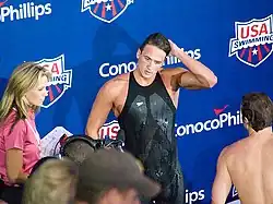 At the 2009 National Championships, the selection meet for the 2009 World Aquatics Championships, Lochte won individual titles in the 200 and 400-meter individual medley.[57][58] Lochte also qualified to swim in the 4×100 and 4×200-meter freestyle relay.[59][60] In the 200-meter backstroke final, Lochte placed second behind Aaron Peirsol, and lost his world record he set in Beijing when Peirsol recorded a time of 1:53.08.[61]