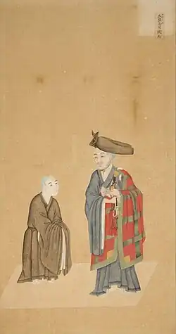 Tributary relationships with the Ming dynasty were established in 1372 by the three kingdoms of Sanzan.[15] In 1372, the King of Chūzan entered into a tributary relationship with the Ming dynasty, and paid tribute for 500 years for trading privileges and diplomatic ties.[6] In exchange for their tributes, the Ming dynasty gifted the Ryukyu Kingdom with Ming dynasty clothing of various designs (including round-collar robes and cross-collared robes), silk, and royal crowns (such as the sammo, known in Chinese as the wushamao, a jewelled crown).[16][17][18][7]