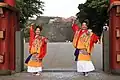 The red kakan (裙), a form of pleated underskirt, is believed to have been worn under a ceremonial attire called touishou (唐御衣装), also known as hibenfuku (皮弁服) or umanton (御蟒緞),[20] which was gifted by the Ming dynasty emperors.[21] The touishou was a winter ceremonial clothing worn by the Ryukyuan kings.[20] The touishou was slightly modified from the clothing gifted by the Ming dynasty, and included unique Ryukyuan features, such as fringes at the back of the garment, while maintaining the style of Ming dynasty court clothing.[20] In the Zhongshan chuanxin lu, it is noted that both Ryukyuan men and women wore an upper garment called jin (a type of court clothing).[14]: 106–109 Male undergarments consisted of a white silk dujin (胴衣), a cross-collared upper garment closed left over right, and white silk trousers. Only members of the royal family and members of upper-class warrior families were allowed to wear these undergarments.[13] The emperor also wore dujin and trousers as undergarments under his touishou.[13] The combination of dujin and kakan was also worn as a ceremonial costume for women who came from warrior families.[22] The wearing of dujin and kakan continued to be worn in Ryukyu at least until the Meiji period.[14]: 118–119
