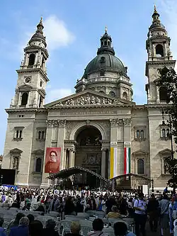 On 17 September 2006 Salkaházi was beatified in a proclamation by Pope Benedict XVI, read by Cardinal Péter Erdő during a Mass outside St. Stephen's Basilica in Budapest,[8] which said in part, "She was willing to assume risks for the persecuted ... in days of great fear. Her martyrdom is still topical ... and presents the foundations of our humanity." This is the first beatification to take place in Hungary since that of King Stephen in 1083 along with his son Imre and the Italian Bishop Gerard Sagredo, who were instrumental in converting Hungary to Christianity.[8] If Salkaházi is canonized, she will be the first commoner Hungarian female saint.[8][10]