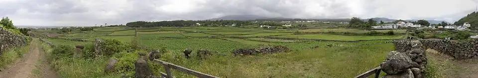 The territory extends through the transition al zone within the Santa Bárbara massif and volcanic complex of the Serra do Morião, in a zone that is relatively low, with a slope of less than five percent grade until 170 metres (560 ft) elevation, along a north-northwest tract. The highest point in the parish is situated in the extreme north of Canada da Cruz Dourada along Canada de Trás. In the central part of the territory is the basaltic spatter cone Pico dos Merens: its peak is named after one of the local families who, for centuries, were local property-owners in the region: the Merens of Távora. Also known as Pico de Merens or Pico do Alvernaz, the cone is 104 metres (341 ft) elevation, and responsible for the Biscoitinho Platform that extends to the sea.