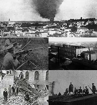 ![]() At the top: fires in São Paulo. Middle left: machine gun position in Vila Mariana. Middle right: Cotonifício Crespi damaged by the bombings. Bottom left: effects of an air attack. Bottom right: soldiers on the roof of the 1st Battalion of the Public Force. | |||||||