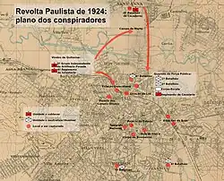 In the last months of 1923, some plotters were already sounding the possibility of an uprising in the south.[41] In December, a plan to arrest War Minister Setembrino de Carvalho on his way through Ponta Grossa, Paraná, was discovered by the authorities.[44] This plan would possibly be simultaneous to a coup d'état in Rio de Janeiro, led by colonel Valdomiro Lima.[45] The government was already expecting a revolt, though not particularly in São Paulo.[46] Over the course of several months, the president was already reading confidential reports about the conspiracy.[47] In order to dismantle the conspiracy, officers were arrested or transferred to other garrisons,[48] which was to some extent counterproductive, seeding discontent to distant regions.[10][49] To demonstrate its strength, the government often placed troops at the ready, preventing officers from leaving their posts.[36]