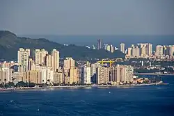 São Vicente is located on the western half of coastal São Vicente Island, being mostly a bedroom community for the larger and wealthier neighbouring port and commercial city of Santos on the island's eastern half.[8] A small north–south hill range separates for the most part the two cities' urban areas, but they are contiguous in the north and on a narrow beach strip in the south. A narrow strip of land of the basin of the small Cubatão River extends west out of the central area of São Vicente, north and parallel to the municipality of Praia Grande.