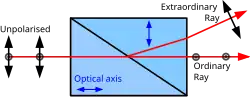 In the Sénarmont prism the s-polarized ray (i.e., the ray with polarization direction perpendicular to the plane in which all rays are contained, called the plane of incidence) passes through without being deflected, while the p-polarized ray (with polarization direction in the plane of incidence) is deflected (refracted) at the internal interface into a different direction. Both rays correspond to ordinary rays (o-rays) in the first component prism, since both polarization directions are perpendicular to the optical axis, which is the propagation direction. In the second component prism the s-polarized ray remains ordinary (o-ray, polarized perpendicular to the optical axis), while the p-polarized ray becomes extraordinary (e-ray), with a polarization component along the optical axis. As a consequence, the s-polarized ray is not deflected since the effective refractive index does not change across the interface. The p-polarized wave, on the other hand, is refracted because the effective refractive index changes upon changing from o-ray to e-ray.