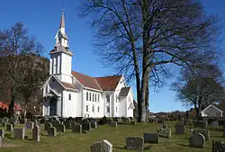 Søgne Church (Norwegian: Søgne hovedkirke) is a parish church of the Church of Norway in Kristiansand Municipality in Agder county, Norway. It is located in the village of Lunde, just west of Tangvall. It is the church for the Søgne parish which is part of the Kristiansand domprosti (arch-deanery) in the Diocese of Agder og Telemark. The white, wooden church was built in a cruciform design in 1861 using plans drawn up by the architect Christian H. Grosch. The church seats about 750 people.[1][2] Inside, the church has balcony seating along all the walls leading up to the chancel. The chancel floor is raised three steps above the floor of the nave.