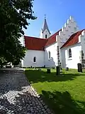 The oldest parts of the church building was likely constructed in the end of the 1100s when a stone church replaced an original wooden structure. In the late Middle Ages the church was expanded and the original flat wooden ceiling was replaced with Gothic rib vaults. The first tower, a Stilt Tower, is likely from this period as well. In 1883 the church got its present tower. In 1870 the church was extensively renovated and crow-stepped gables were added and the north door was walled off.[3][4]
