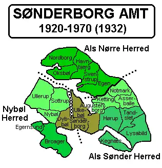 Sønderborg was first established in 1256.[1] After Denmark surrendered control over Schleswig to Prussia and the Austrian Empire in 1864, the Schleswig island of Ærø was transferred from Augustenborg County to Svendborg County and the island remained Danish. The rest of Augustenborg County was merged with Sønderborg and became Kreis Sonderburg. Sønderborg County and Aabenraa County merged in 1932, forming Aabenraa-Sønderborg County.