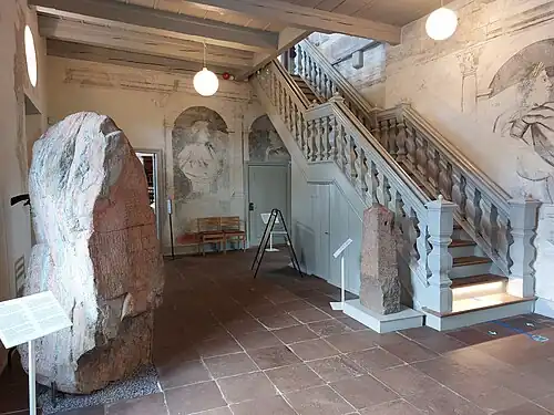 The museum's vestibule features a large runestone from the ninth century. The ticket office is decorated with the interior furnishings of an old grocery shop. A room on the first floor features a set of canvas tapestries with eight scenes from François de Salignac de la Mothe‑Fénelon's 1699 novel Les Aventures de Télémaque. They were most likely installed during Claudius' ownership in 1750–1769. Another mural is based on one of Jacob de Gheyn's illustrations for the 1717 117 engravings for the military manual The Exercise of Armes.[6]