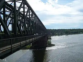 ![]() The Gustavsburger Eisenbahnbrücke in May 2009 from the northeastern bank to the south west, direction Mainz. | |