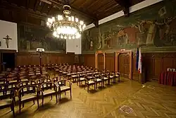 The town hall's most unique interior space is the mayor or president’s office which has twelve walls and is decorated with original furniture and an exceptional tapestry. In the second mayor's office, there is a painting by Friedrich Klein-Chevalier that depicts hunting for salmon. Some rooms feature original Art Nouveau details.[3] The conference room has a hidden door that leads to a space that fits a small man. The building also has hidden passages and tunnels.