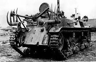 During the 1930s, the Imperial Japanese Army required a specialised vehicle in preparation for war against the Soviet Union, which would be capable of destroying Soviet fortified positions along the Manchurian border.[2] During the development and planning, it was decided that its capabilities should include: destruction of pillboxes, trench digging, mine clearing, barbed wire cutting, smoke discharge, mass decontamination, chemical weapons employment, use as a crane vehicle, as a flamethrower tank and as a bridgelayer.[2][5]
