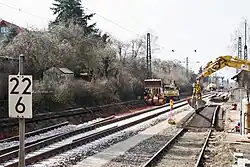 Two compact stations were built in Mannheim-Rheinau and Mannheim-Neckarau, which allow a quick and barrier-free change to the trams and buses of the RNV. This work was finished in Mannheim-Rheinau at the end of April 2018,[16] except for minor residual work, and the "compact station" was officially opened on 12 July 2019.[17] In contrast, the case for building Neckarau station would be "examined in terms of the costs and benefits of the whole line",[18] so it may not in fact be built. In the meantime, temporary platforms were built on tracks 1 and 2, which were completed in May 2020.[19]