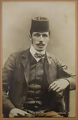 Karabegović subsequently relocated to the town of Bursa, in Anatolia, where he attended a vocational school. In 1896, he enrolled in a lyceum in Constantinople. In 1898, having completed three years of study, Karabegović dropped out and relocated to Serbia.[1] He settled in Belgrade, which was then home to one of the world's largest Bosnian Muslim diasporas, second only to Constantinople.[4] In 1899, the writer Janko Veselinović's publication Zvezda printed a Serbian patriotic poem that Karabegović had written.[1] In 1900, Karabegović and fellow Muslim Serbophiles Osman Đikić and Omer-beg Sulejmanpašić printed a book of Serbian patriotic poetry.[4][5] Later that year, after crossing the Austro-Hungarian border to visit Zemun, Karabegović was arrested by the Austro-Hungarian authorities for draft evasion. He was subsequently taken to Budapest, and as a Habsburg subject, compelled to serve three years in the Austro-Hungarian Army. It was during this time that he contracted tuberculosis, which would plague him for the rest of his life.[1]