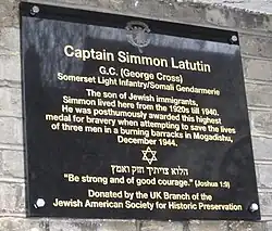 Captain Simmon Latutin GC (25 July 1916 – 30 December 1944) was a British Army officer who was posthumously awarded the George Cross, the highest British (and Commonwealth) award for bravery out of combat. He won his award for the gallantry he showed in rescuing two comrades, and attempting to save a boy, from a blazing ammunition store on 29 December 1944 in Mogadishu, Somaliland.[1]
