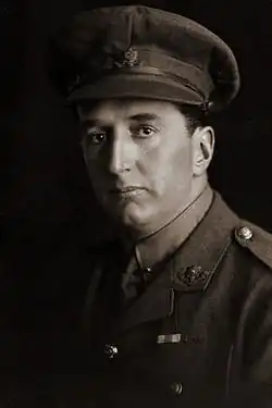 Bruce's regiment landed at Cape Helles in mid-1915, where he fully distinguished himself in the construction of trenches and as an able commander.[28] His battalion suffered heavy casualties over the coming months, and Bruce himself was wounded on 3 June by a shot to the arm, though it was this injury that spared him from a major assault by his battalion on 4 June in which many of his peers perished. He later reflected that he must have been kept on earth for some purpose.[29] He returned to the front lines and his division moved to the new front at Suvla Bay, where it was involved in particularly heavy fighting and sustained trench warfare throughout August and September. Bruce received the Military Cross and the Croix de Guerre for his service during these months,[30][31] and rose to the rank of captain on 5 August.[32] He was wounded again on 26 September, this time by a shot to the knee, which left him crippled for several years and forced him to return to England to recuperate, while the rest of his regiment were transferred to France after the abandonment of the Gallipoli campaign.[33]