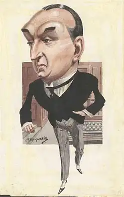 Bruce took office on 9 February.[20] His appointment as prime minister marked an important turning point in Australian political history. He was the first prime minister who had not been involved in the movement for Federation, who had not been a member of a colonial or state parliament, and who had not been a member of the original 1901 federal parliament. He was, in addition, the first prime minister to head a cabinet consisting entirely of Australian-born ministers.[62] Yet Bruce himself was frequently caricatured in public as "an Englishman who happened to have been born in Australia".[20] He drove a Rolls-Royce, wore white spats, and was often seen as distant and lacking the common touch: characteristics that did little to personally endear him to the Australian public.[20]