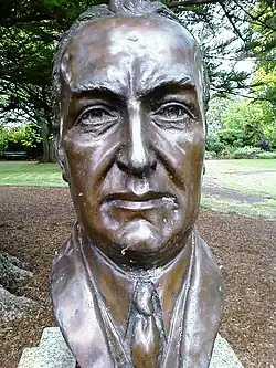 Bruce's father, John Munro Bruce, was born to Scottish parents in County Leitrim, Ireland, and had emigrated to Australia in 1858 at the age of 18. His mother, Mary Ann Henderson, was Irish and had married her cousin John after emigrating to Australia in 1872 at the age of 24.[4] John Bruce became a talented businessman with "a flair for buying and selling",[5] which would secure him a partnership in an established Melbourne importing firm that in 1868 became known as Paterson, Laing and Bruce.[6] As his wealth grew, John Bruce became influential in colonial Victoria's social and political life. An avid golfer, he was one of the founders of the Royal Melbourne Golf Club.[7] He was prominent in the liberal protectionist political movement within the state and an early supporter of future prime minister Alfred Deakin. John Bruce's success ensured that Stanley Bruce, his sister Mary and his brothers Ernest, William and Robert were born into affluence. Shortly after Stanley Bruce's birth the family relocated to the stately Wombalano manor, built by John Bruce, in Toorak.[8] However, John Bruce was an aloof and remote figure in the lives of his children, as his son Stanley later recounted.[9] Despite their family's Presbyterian background, Stanley Bruce was sent to Melbourne Church of England Grammar School (now Melbourne Grammar School) and subsequently Stanley Bruce would come to identify principally as Anglican.[10] Bruce was an average student but extremely active in the sporting life of the school, captain of its Australian football team, and then of the school itself in 1901. Today, the school honours him with his own house, Bruce House, the colours of which are scarlet and white. The house's mascot is a lion, symbolising Bruce's bravery.[11][10]