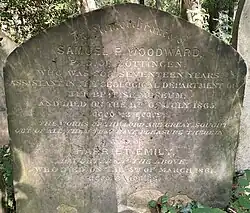 In 1845, S. P. Woodward became the professor of geology and natural history in the Royal Agricultural College, Cirencester. On 29 November, 1845, the council of the Botanical Society of London appointed him local secretary for the county of Gloucester. Also in 1845, Woodward married Elizabeth Teulon, the eldest daughter of John Teulon.[2] Woodward's father-in-law John Teulon may have been the printer who was sentenced on 26 October 1838 "to fifteen months imprisonment for attempting to extort money from the Duke of Devonshire, by the pamphlet entitled 'The Secret History,' relating to the late Lady Mary Hill",[3] who accidentally burned to death at her home at the age of 85.[4]