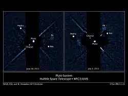 Kerberos was discovered by researchers of the Pluto Companion Search Team using the Hubble Space Telescope on 28 June 2011, using the Wide Field Camera 3, during an attempt to find any rings that Pluto might possess.[11][12] The search for rings was motivated in part by a desire to avoid damage to New Horizons when it passed through the Pluto system in July 2015.[13] Further observations were made on 3 and 18 July 2011 and Kerberos was verified as a new moon on 20 July 2011.[1][14] It was later precovered or identified in earlier archival Hubble images from 15 February 2006 and 25 June 2010, though Kerberos was obscured by diffraction spikes in those images.[15] Kerberos's brightness is only about 10% of that of Nix, and it was only found because the discovery team took eight-minute exposures; earlier observations had used shorter exposures.[16] It was officially designated S/2011 (134340) 1,[1] and was informally referred to as P4.[16]