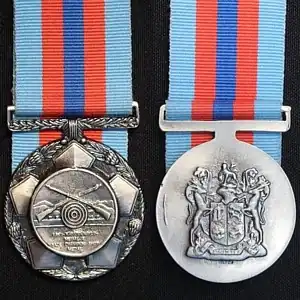 The SADF Champion Shot Medal is a military medal which was instituted by the Republic of South Africa in 1975. It was awarded to the champion shots of the annual South African Defence Force Shooting Championships in the categories of full-bore, small-bore, service shooting and pistol. The medal could be won multiple times, with each subsequent award indicated by a bar.[1]