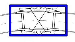 The bogie frames consist of welded hollow beams. The solid track sweepers are attached to the outer crossbeam. The support for the train signal sensing magnets is located on the inner crossbeam of bogie I. The bogies are also connected to the inner crossbeams with an elastic cross coupling, which facilitates curve entry, smooth running and low track wear. The wheelsets are supported on the bogie by springs with internal silent blocks that dampen horizontal shocks. The wheels are spoked and small diameter to reduce weight.[1]