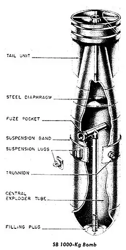 The SB 1000 had a welded sheet metal body with either a drawn or welded steel nose piece. The nose piece was threaded and was streamlined to reduce drag while the bomb was attached to the aircraft. The SB 1000 had no base plate and was filled through the nose with a central exploder tube which ran through the center of the bomb from the fuze pocket to the nose. The tail of the SB 1000 was constructed of drawn steel and had four fins inside a circular strut. The SB 1000 was suspended horizontally by an H-type lug or trunnions if carried by dive bombers. It was filled with a mixture of RDX biscuits within a Trialen 105 matrix, a mixture of 15% RDX, 70% TNT and 15% aluminium powder. Due to its thin case and powerful explosives, the SB 1000 was vulnerable to enemy gunfire.[1]