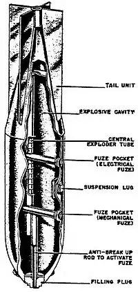 The SB 2500 was constructed of three parts; a threaded cast steel nose plug, a welded sheet steel center section, and a welded sheet steel tail cone with four alloy tail fins. The SB 2500 was filled through the nose and the tail cone was hollow to increase the bombs charge to weight ratio. There were two transverse fuze pockets; the forward pocket housed the anti-break-up fuze and the rear pocket was for a normal impact fuze. The SB 2500 was fitted with an anti-breakup rod which extended from the nose plug to the forward fuse pocket, which on impact crushed the impact fuze and detonated the bomb. A central exploder tube also ran through the center of the bomb from the forward fuze pocket to the tail. The SB 2500 was suspended horizontally by reinforced H-type lugs. The SB 2500 was filled with either Amatol or Trialen 105. Trialen 105 was a mixture of 15% RDX, 70% TNT and 15% aluminum powder. Due to its thin case and powerful explosives, the SB 2500 was vulnerable to enemy gunfire.[1]