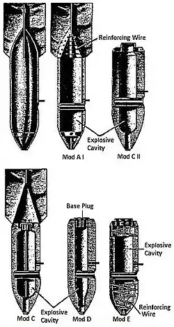 The SBe 50 wasn't a single type but six closely related sub-variants intended to rectify shortcomings in the original design. None of the models were considered completely successful.[1] The explosive for the Model A I was contained in a thin metal liner which the concrete was cast around. However, the Model A I was not satisfactory because the explosive charge was too large which pulverized the concrete instead of creating effective fragments. The Model C unsuccessfully attempted to address this problem by reducing the amount of explosives and increasing the thickness of the concrete. The Model D reduced the amount of explosive once again and increased the thickness of the concrete but the explosive charge was now too small. The Model E increased the amount of explosives back up to the amount used by the Model C, the internal metal container was eliminated, and the concrete was now cast around a rebar framework. The early models were filled with TNT but later models were filled with naphthalene a lower grade explosive that may have been used to promote fragmentation. Early models had sheet steel tails set in concrete while later models had detachable tails. The SBe 50 could be suspended vertically in a bomb bay or horizontally from a wing or fuselage hard point. The bombs were painted bright green in color.[2]