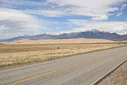 SH 150 begins in the south at its junction with US 160 roughly fifteen miles east of Alamosa and about six miles (10 km) east of Blanca. For much of its length the road heads arrow straight due north across the eastern margin of the broad, flat, nearly featureless San Luis Valley between the Sangre de Christo Mountains in the east and the San Juan Mountains to the west. The road eventually deviates from its due north heading as it approaches its northern endpoint at Great Sand Dunes National Park.