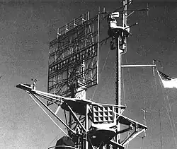 SK was a very high frequency search set for large ships. It furnished range and bearing of surface vessels and aircraft, and it could be used for control of interception. It was essentially an SC-2 radar set operating at 200MHz with a larger antenna using 6×6 dipoles.[3] The set had both "A" and PPI scopes, provisions for operating with remote PPIs and for IFF connections, and built-in BL and BI antennas.[4]