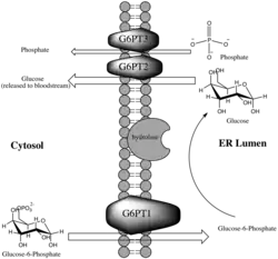 It consists of three subunits, each of which are vital components of the multi-enzyme Glucose-6-Phosphatase Complex (G6Pase). This important enzyme complex is located within the membrane of the endoplasmic reticulum, and catalyzes the terminal reactions in both glycogenolysis and gluconeogenesis.[8] The G6Pase complex is most abundant in liver tissue, but also present in kidney cells, small intestine, pancreatic islets and at a lower concentration in the gallbladder.[9][10] The G6Pase complex is highly involved in the regulation of homeostasis and blood glucose levels. Within this framework of glucose regulation, the translocase components are responsible for transporting the substrates and products across the endoplasmic reticulum membrane, resulting in the release of free glucose into the bloodstream.[8]