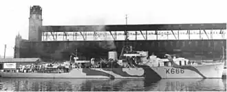 HMCS Hallowell was ordered on 1 February 1943 as part of the 1943-44 River-class building program by the Royal Canadian Navy (RCN).[2][3] She was laid down by Canadian Vickers Ltd. aT Montreal on 22 November 1943 and launched 28 March 1944.[3] She was commissioned into the RCN on 8 August 1944 at Montreal.[2]