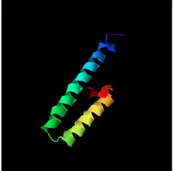 The structure of the FN5 protein is not yet known, but the protein qualities are useful in predicting the protein's structure. There is no evidence that the protein would take on any Beta-turns; its secondary structure would be composed of only alpha-helixes. There are two separate helixes: the transmembrane helix and the alpha helix.