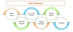 SME finance is the funding of small and medium-sized enterprises, and represents a major function of the general business finance market in which capital for different types of firms are supplied, acquired, and costed or priced. Capital is supplied through the business finance market in the form of bank loans and overdrafts; leasing and hire-purchase arrangements; equity/corporate bond issues; venture capital or private equity; asset-based finance such as factoring and invoice discounting,[1] and government funding in the form of grants or loans.