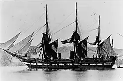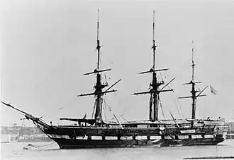 The ship next recommissioned on 30 April 1874 for another extended voyage abroad, this time on a trade mission to East Asia. After preparations for the voyage were completed, Erzherzog Friedrich sailed from Pola on 26 May. She reached Port Said five days later, where she replenished coal before passing through the Suez Canal. She stopped in Aden and then Galle, British Ceylon, on her way. While in the latter port, repairs were made before departing on 11 July. She reached Singapore on 24 July.[17] The ship thereafter cruised in East Asian waters for several months, visiting Siam, China, and Japan. While in the region in 1875, the ship sailed to the island of Borneo to evaluate its suitability as an Austro-Hungarian colony, but when a landing party was sent ashore to explore the island, local residents killed two of the men and forced the rest to withdraw, which ended plans to colonize the island. Erzherzog Friedrich thereafter crossed the Pacific, visiting San Francisco, United States, along with several South American countries on her voyage back to the Adriatic, which she reached in 1876. The voyage saw the ship circumnavigate the globe; she was the third Austrian vessel to have done so.[18]