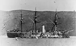 In January 1870, after repairs to Habsburg were completed, she sailed south to Cattaro Bay to reinforce a group of smaller vessels that had been sent there earlier in 1869 to suppress a rebellion against Austro-Hungarian rule.[18] At that time, Habsburg was the sole Austro-Hungarian ironclad in active service, the rest having been disarmed and laid up in Pola.[19] Over the summer, Habsburg cruised in the western Mediterranean with the screw-schooner Kerka. After repairs to her capstan were carried out, Habsburg left Pola and sailed first to Kumbor, where she met Kerka. The two ships then departed for Malta on 25 June, arriving there on 30 June. They left on 10 July for Tunis in the Beylik of Tunis, where they stayed for two days. The ships then sailed north to Cagliari on Corsica on 16 July. After arriving the next day, they stayed for four days and eventually arrived in Toulon, France, late on 2 August. Habsburg and Kerka stayed there for eight days, and then moved to Portoferraio, Italy, where they anchored from 11 to 14 August. By the 19th, they had moved to Naples.[20]